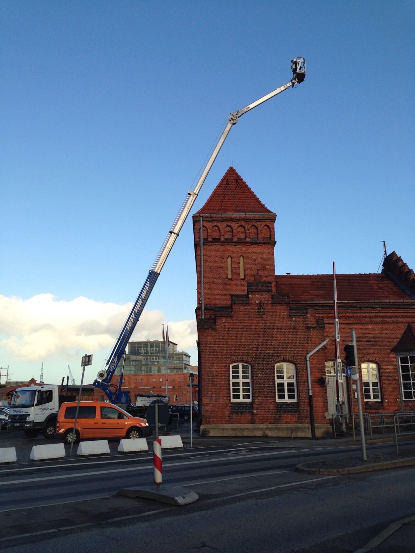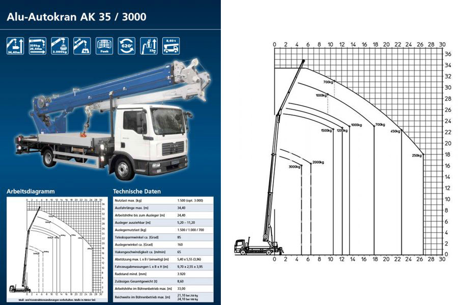 Der Kran kann zum heben von Lasten bis zu 3 to eingesetzt werden oder als Arbeitsbühne. Im Kranbetrieb ist die max. Hakenhöhe 35m, im Arbeitsbühnenbetrieb kommen wir 33m hoch.