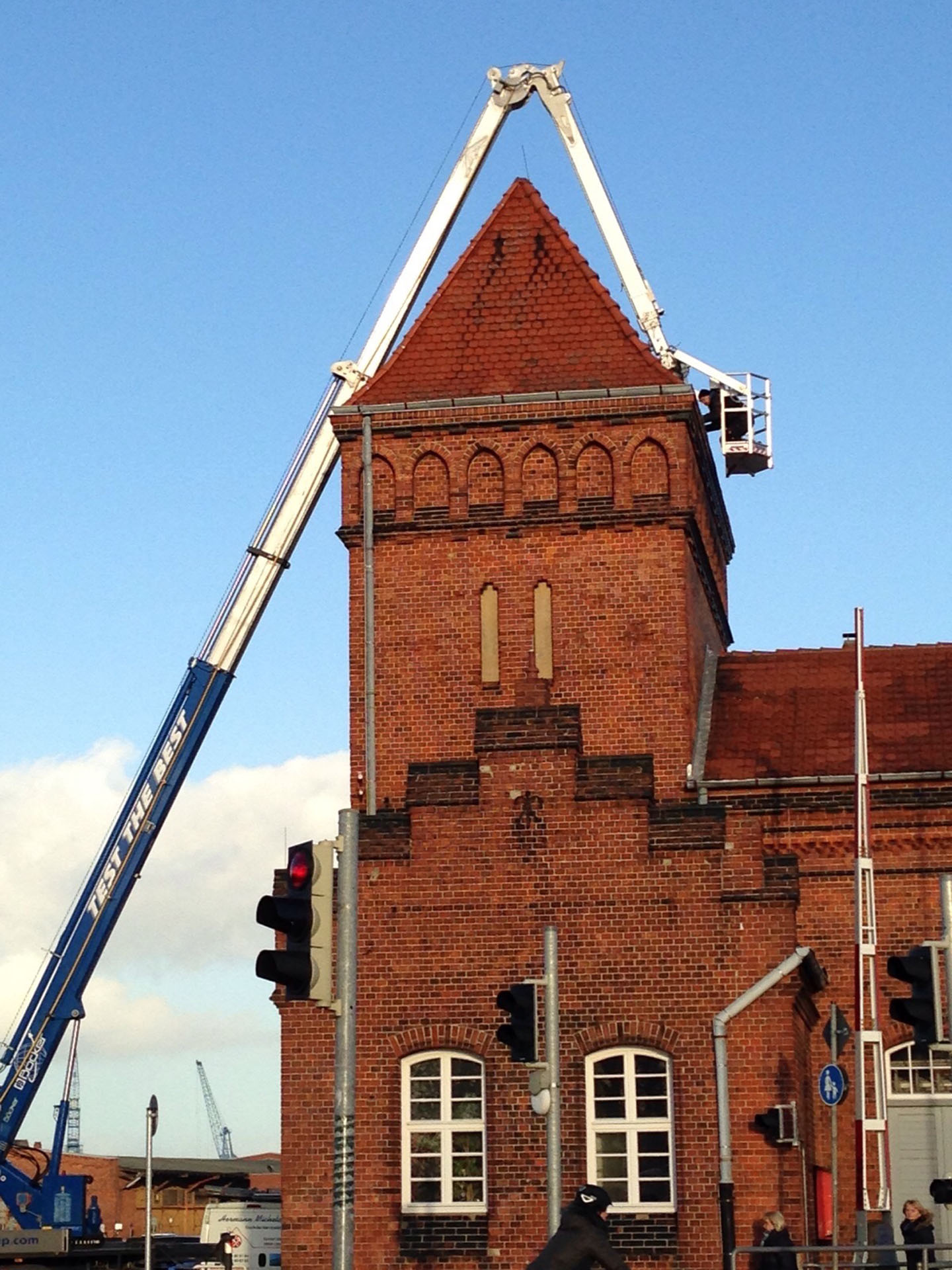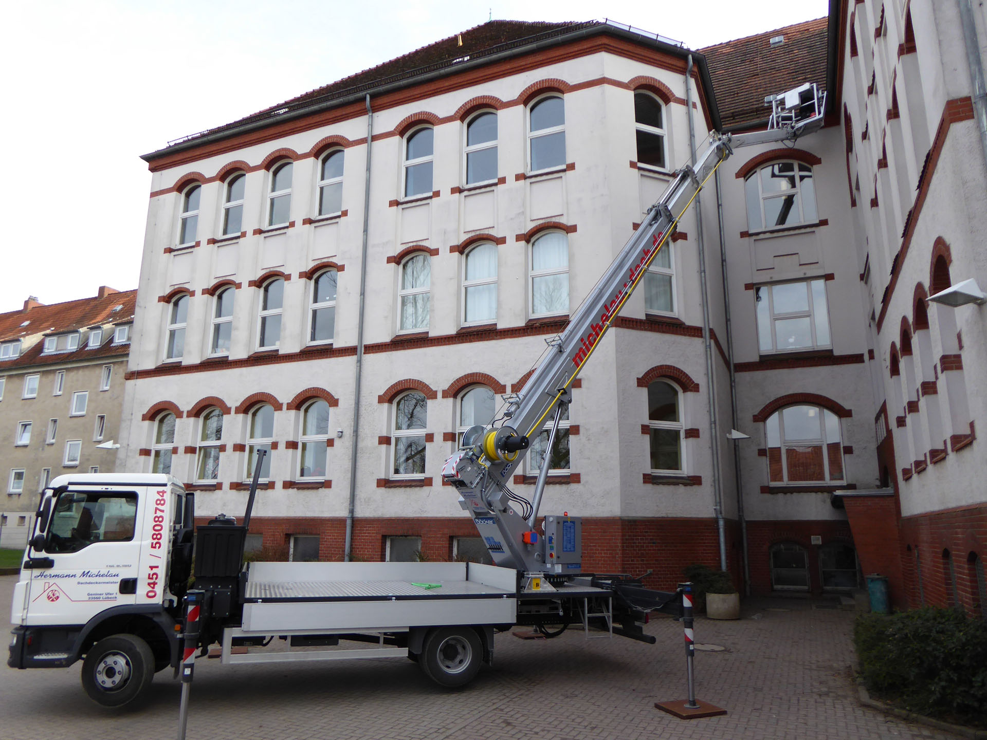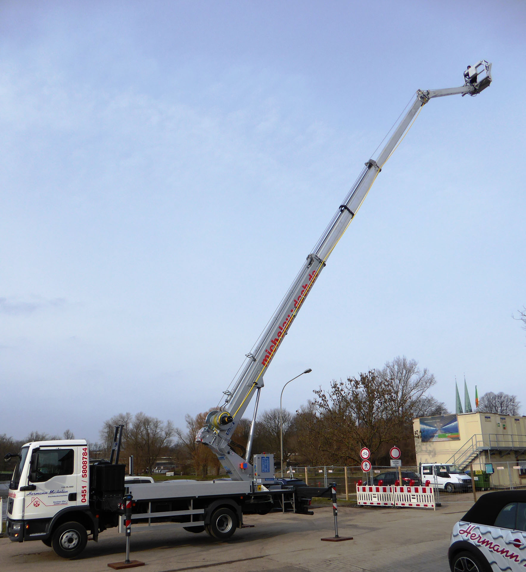 Der Kran kann zum heben von Lasten bis zu 3 to eingesetzt werden oder als Arbeitsbühne. Im Kranbetrieb ist die max. Hakenhöhe 35m, im Arbeitsbühnenbetrieb kommen wir 33m hoch.